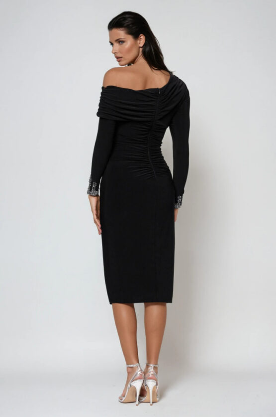 - Asymmetrical waist tucks and cascade draped ruffle