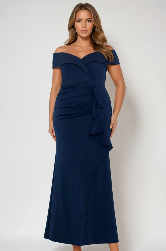 Details: The Bianca Gown is crafted from a stretch crepe fabric and features a side neckline with short sleeves and mermaid style skirt. Dress is fully lined with back zipper. Size is true to size.