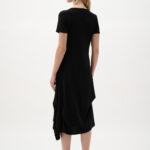 This silky knit dress features a boat neckline and short sleeves in a flowing trapeze silhouette. Tuck stitching details add subtle texture, while the below-the-knee length offers a balanced, graceful finish.