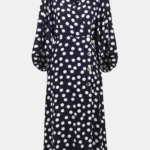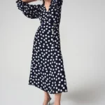 This dot print georgette wrap dress boasts puff sleeves and metallic buttons along the skirt’s wrap. Designed with an elastic back waist for a flattering fit, it flows into a midi-length skirt for a timeless, elegant silhouette.