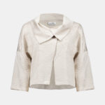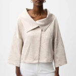Elegant with a modern edge, this pleated satin boxy jacket features an overlapping collar detail and relaxed three-quarter sleeves, offering an elevated finish to any look.