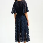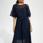 Joseph Ribkoff Signature | Midnight Blue 3D Embroidered Chiffon Fit And Flare Dress With Sash Belt