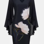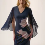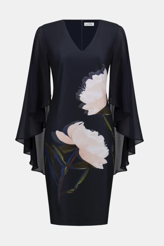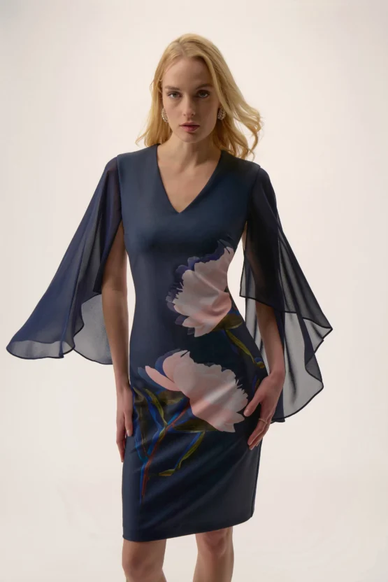 Joseph Ribkoff Signature |Midnight Blue/Multi Silky Knit & Chiffon Floral Placement Sheath Dress 254734