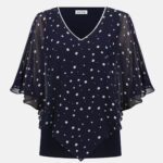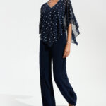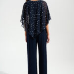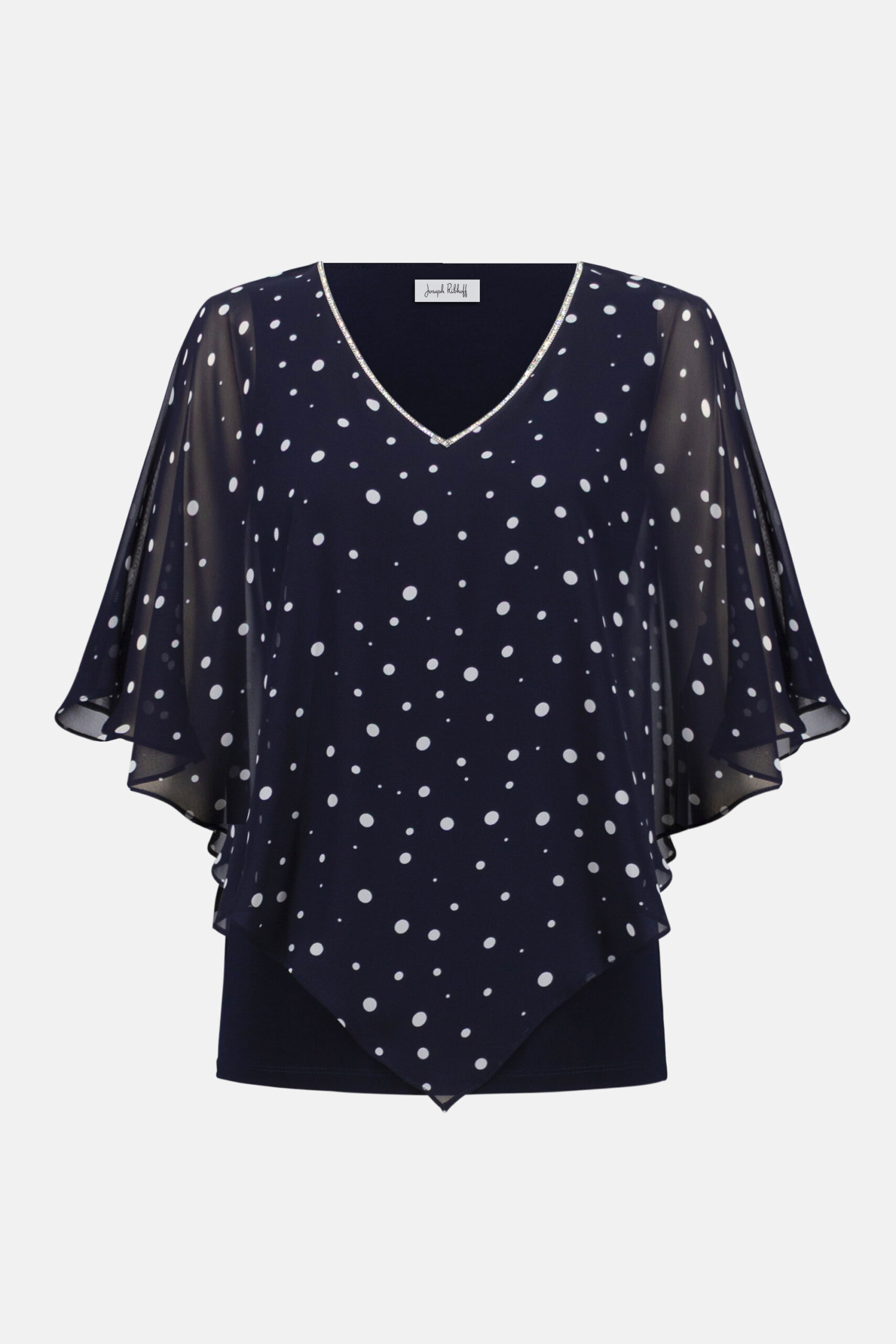 Joseph Ribkoff Signature | Midnight Blue/Vanilla Silky Knit Dot Print Poncho With Rhinestones Trim 261766