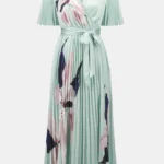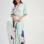 Lustrous satin sets the stage for a floral placement print, shaping this fit and flare dress with timeless elegance. A wrap neckline, pleated skirt, and sash belt define the waist, while flared sleeves add flowing charm.