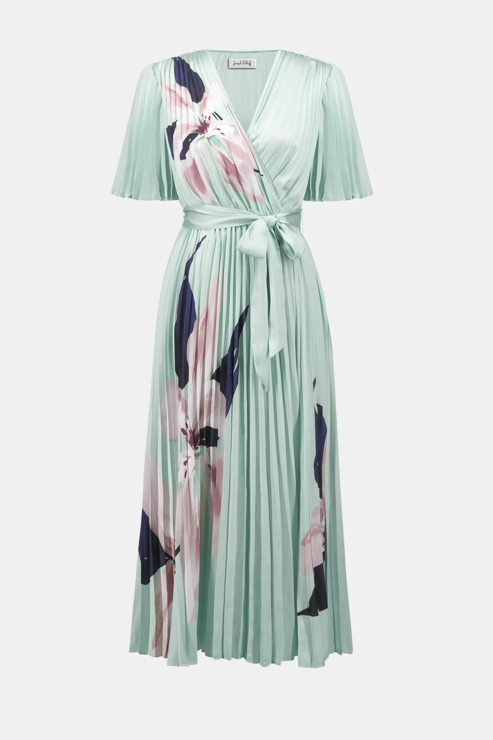 Lustrous satin sets the stage for a floral placement print, shaping this fit and flare dress with timeless elegance. A wrap neckline, pleated skirt, and sash belt define the waist, while flared sleeves add flowing charm.